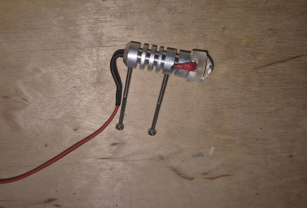 Für die 1 bzw. 3W LEDs habe ich mir noch Kühlkörper angefertigt. Einfach ein 10mm Alu-Rundstab aus dem Baumarkt auf die passende Länge gesägt, Kabeldurchführungen gebohrt, Gewinde für die Befestigungsschrauben geschnitten und Kühlrippen auf der Drehbank angebracht. Zum Schluss nur noch die LEDs mit Sekundenkleber aufgeklebt und Kabel verlötet. Dauert ein bisschen, kostet aber fast nix, besonders wenn man die LEDs für ca. 10 cent/Stk beim Ali kauft. In der Pilatus habe ich genau diese LEDs mit Kühlkörpern drin und selbst im Sommer hat es bisher noch keine Kühlprobleme gegeben.