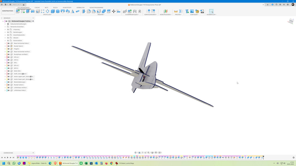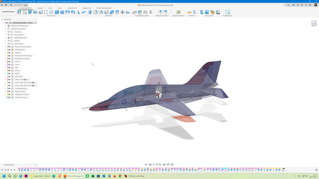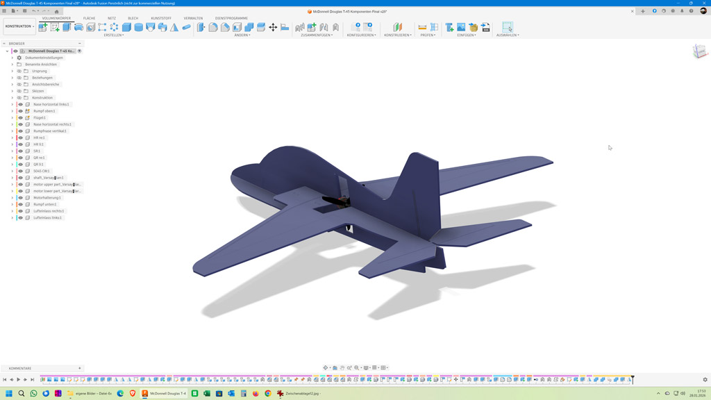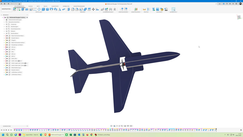 Der ARES fliegt schön, ist mir aber für unsere Halle fast ein bisschen zu groß. Deswegen habe ich mich daran gesetzt mit Fusion 360 einen ähnlichen, aber etwas kleineren Flieger komplett von Grund auf zu konstruieren. Als Vorlage hat mir eine 3-Seiten-Ansicht einer T-45 Goshawk gedient.