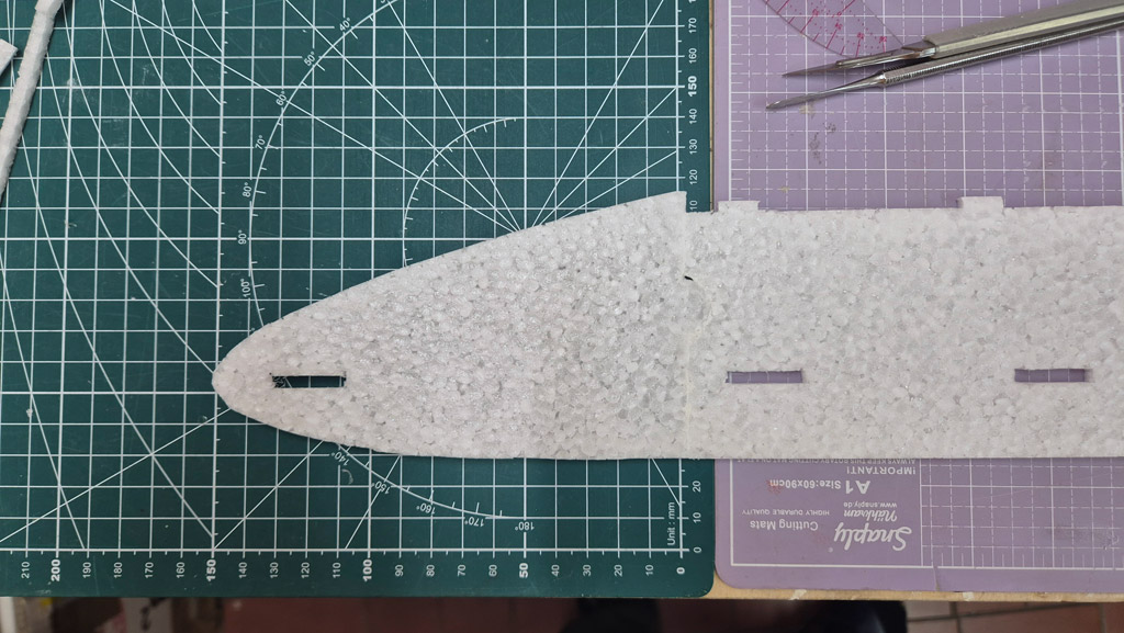 Weiterhin habe ich am Höhenruder den V-Ausschnitt noch nicht gemacht, um mehr Ruderfläche zu haben. Ich denke das lasse ich auch so. Das Seitenruder jedoch werde ich demnächst noch etwas verkleinern, so groß wie im Plan braucht es dann doch nicht zu sein.