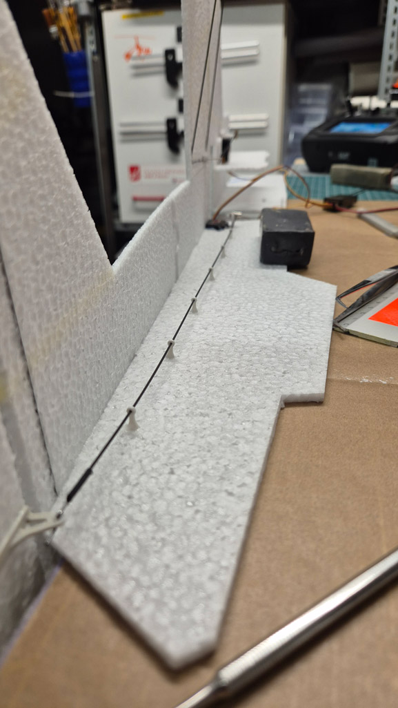 - Die T-45 ist normalerweise ein Tiefdecker. Um die Agilität zu erhöhen, habe ich die Tragfächen angehoben und genau in der Propellerachse positioniert. D.h. mein Flieger ist jetzt ein Mitteldecker. Mal schauen, ob das so hinhaut.